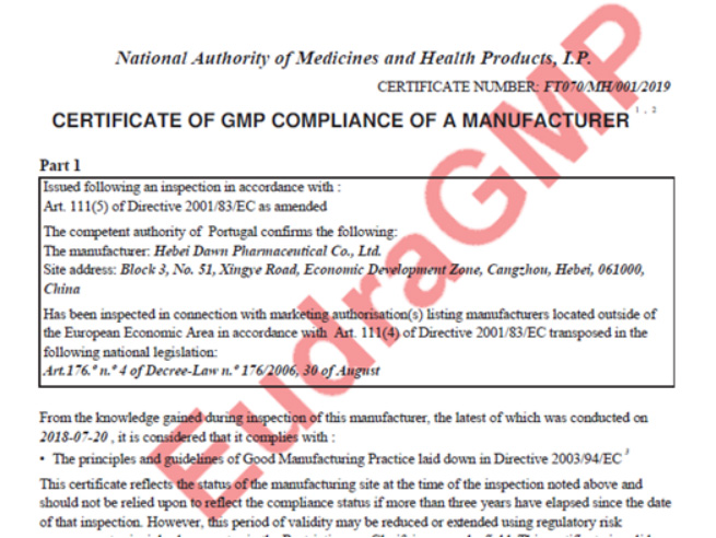 11月04日,河北天成藥業(yè)股份有限公司全資子公司河北道恩藥業(yè)有限公司(Hebei Dawn Pharmaceutical Co., Ltd.)收到了無菌注射劑 EU GMP證書(認證范圍:凍干粉針劑和小容量注射劑;證書編號:FT070/MH/001/2019)。此次 EU GMP證書的獲得,是天成藥業(yè)制劑國際高端認證路上的又一重大突破,代表其質(zhì)量管理水平已達到國際高端水準,也意味著道恩藥業(yè)的抗腫瘤無菌注射劑在歐盟市場打通了GMP藥政和技術(shù)壁壘,對其進軍國際制劑高端市場具有里程碑意義,同時為滄州市首家取得該證書的藥企。
