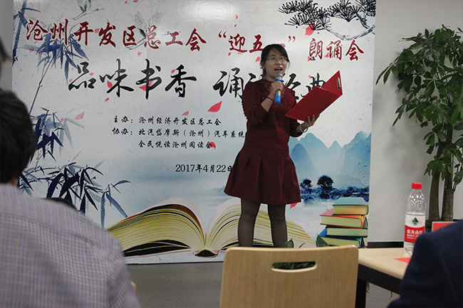 2017年4月22日,滄州開發(fā)區(qū)總工會(huì)主辦,北汽岱摩斯(滄州)汽車系統(tǒng)有限公司工會(huì)、全民悅讀滄州閱讀會(huì)協(xié)辦的“迎五一誦讀會(huì)”如期舉行。此次朗讀會(huì)主題為“品味書香,誦讀經(jīng)典”,是為打造滄州東部新城,在開發(fā)區(qū)推廣全民閱讀的一次嘗試。我公司職工劉艷麗、鄭福貴分別在會(huì)上深情朗讀了詩歌《相信未來》、《希望,展翅飛翔》。